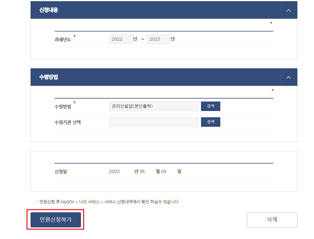 - 사용목적: 사용목적을 적어주시면 됩니다. 저는 종합소득세 신고를 하기 위해서 발급받기 때문에 종합소득세라고 적었습니다.